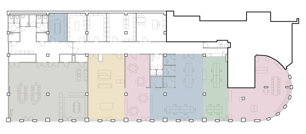 Het basisidee gaat uit van een set in het oog springende kleuren die zorgvuldig op elkaar zijn afgestemd. Door iedere functie zijn eigen kleur te geven ontstaat een heldere ruimtelijke structuur. Het felle turquoise voor de entree, het heldere geel voor de ontwerpstudio, het rustige blauw voor de kantoorruimte en het warme roze voor ruimten waar mensen bijeenkomen voor lessen, overleg en workshops.