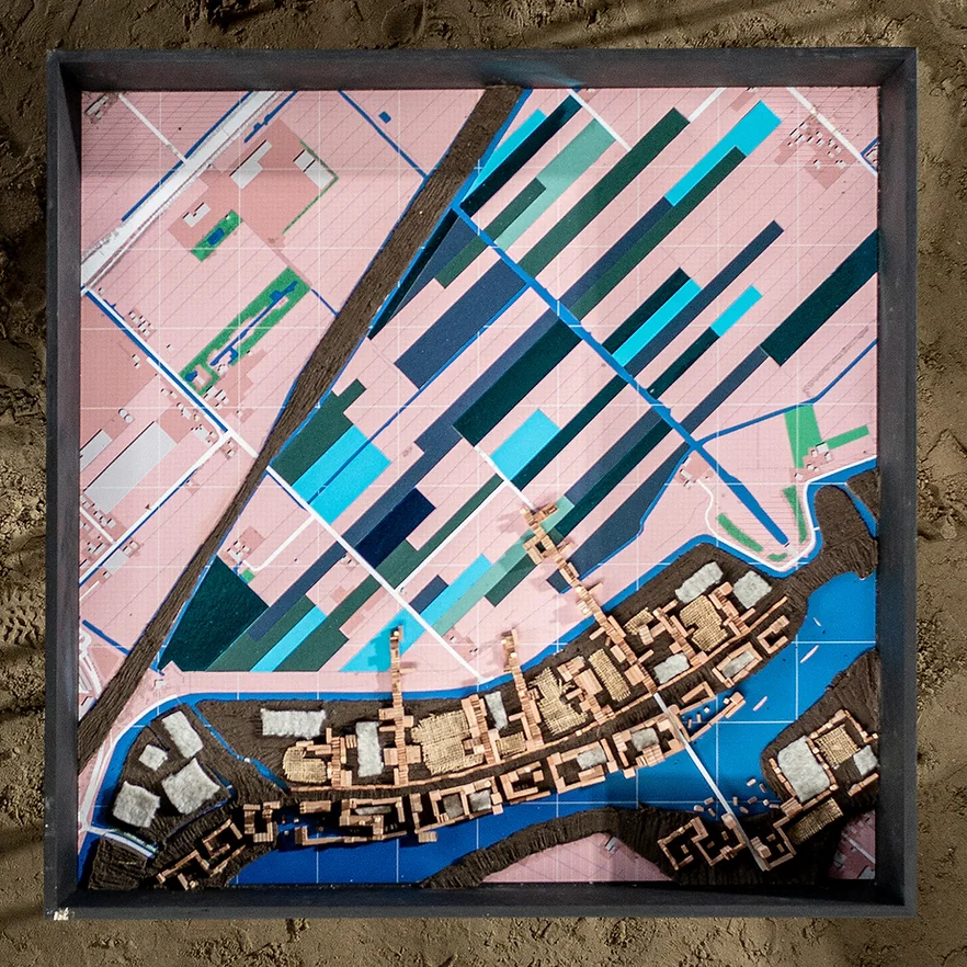 Het antwoord ligt verscholen in drie leefwerelden die we hebben ontworpen. Op de 100 meter brede dijk wordt in hoge dichtheid een dijkstad gemaakt. De laag gelegen polder wordt op termijn vrijgespeeld voor natuurontwikkeling en meer water. Het peil kan hier stijgen.