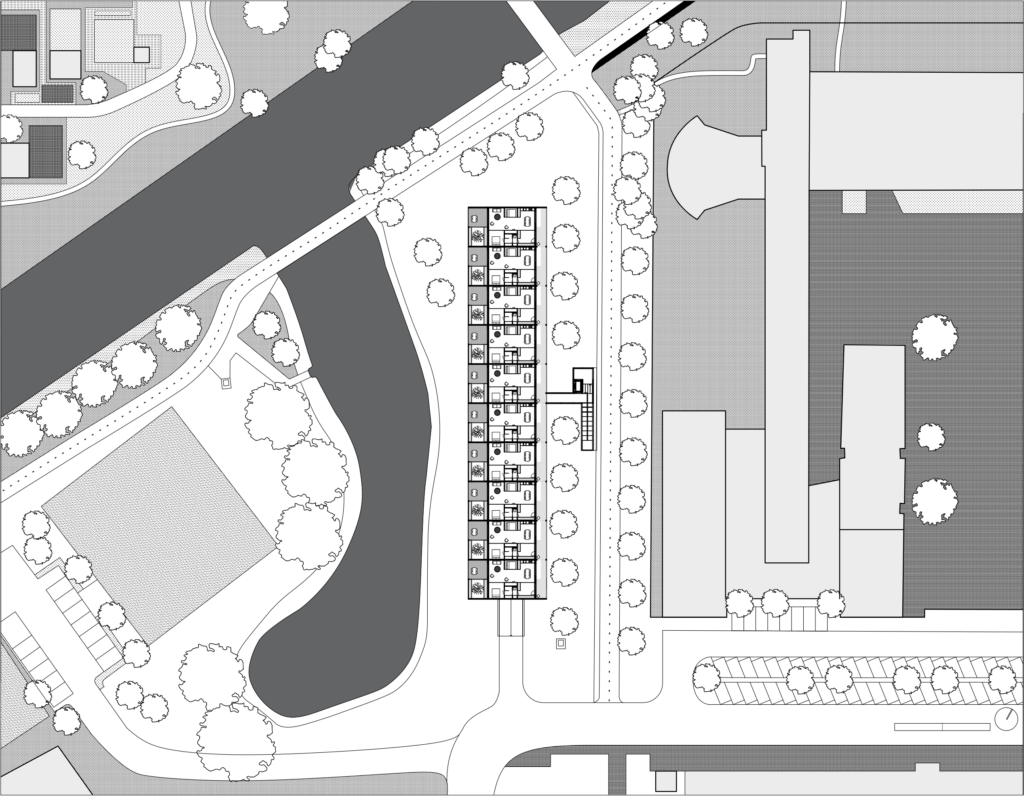 Het woongebouw is ontworpen volgens de principes van een passief huis. Zwaar geïsoleerd, warmte vasthouden in de winter, warmte buiten houden in de zomer. Het project is ontworpen in een 2D modulaire houtbouwsysteem waarmee de bouwtijd wordt verkort en de mogelijkheid er is het gebouw in de toekomst te demonteren. De houten gevel is zo ontworpen dat het gebouw zich stilletjes voegt in de natuurlijke omgeving.