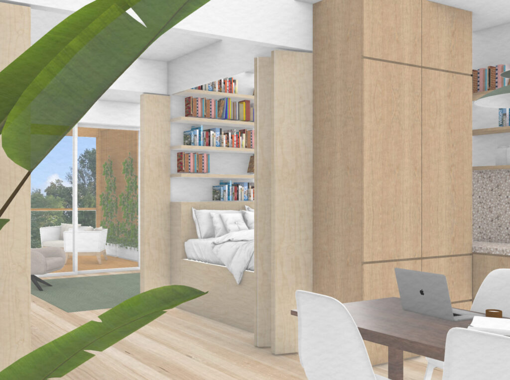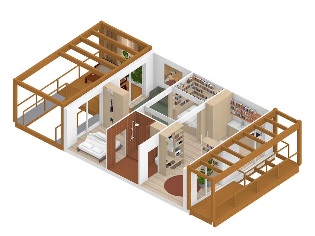De doelgroep senioren heeft een bijzonder interessant profiel. Vaak thuis, veel buiten, werk of hobbies vanuit huis, oppassen op de kleinkinderen, vrienden over de vloer. Op een oppervlakte van 80m2 vraagt dit om een multifunctioneel huis. Een ‘altijd vakantiehuis’ waar activiteiten in elkaar overvloeien en waar alles net even anders mag zijn. Het daybed centraal in de woning is hiervan het mooiste voorbeeld. Een plek om te luieren met een boek, spannende logeerplek voor de kleintjes of om overdag te vertoeven met langdurige (mantel)zorg.