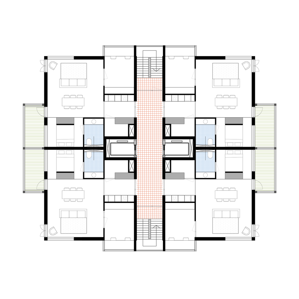 Op elke verdieping zijn de woningen gelegen rondom een gezamenlijke hal. De woning wordt betreden via de keuken, deze informele entree zorgt voor een indirecte relatie tot de buren. Van daaruit loop je de vierkante woonruimte in, die vrij in te delen is. Hieraan gelegen is de grote thuiswerkruimte overgoten met daglicht. Zittend in de erker ervaar je de rijkdom van je omgeving met in de verte het stadspark en historische centrum. De slaapkamer is een knusse plek aan het balkon waarin je teruggetrokken en private sfeer voelt.