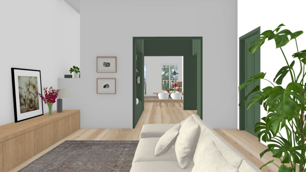 De originele en-suite plattegrond is nog grotendeels intact, met de nieuwe invulling wordt de kwaliteit hiervan maximaal benut met grote open leefruimten op iedere etage. Het trappenhuis wordt in ere hersteld om zo dienst te doen als ontsluiting voor alle woningen. Badruimte en extra kleine kamers zijn steeds opgenomen in de smalle beuk.