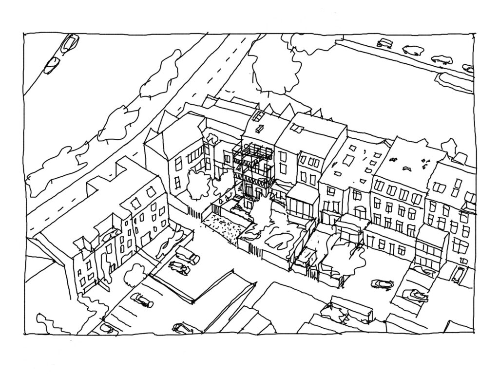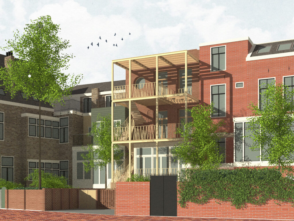 Een rank uitgevoerde stalen frame wordt tegen de bestaande achtergevel geplaatst. Hierin is een trap opgenomen die dient als noodtrap en ‘achterom’. De grote terrassen georiënteerd op het zuiden, zijn een verlengstuk van de woningen. Tegelijkertijd is zonwering geïntegreerd door het plaatsen van lamellen in het frame.
