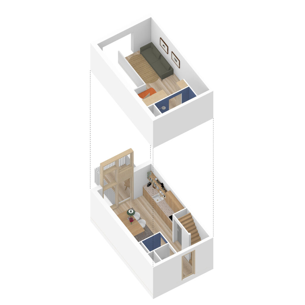 Op elke verdieping zijn de woningen gelegen rondom een gezamenlijke hal. De woning bestaat uit twee verdiepingen en is tegelijkertijd slechts 45m2 groot. Op de onderste verdieping kom je binnen en is de leefkeuken met grote tafel en werkplek. Op de verdieping is een zithoek, slaapplek en badkamer. De woningen worden ontsloten via een dubbel hoge corridor met daglicht van beide kanten.