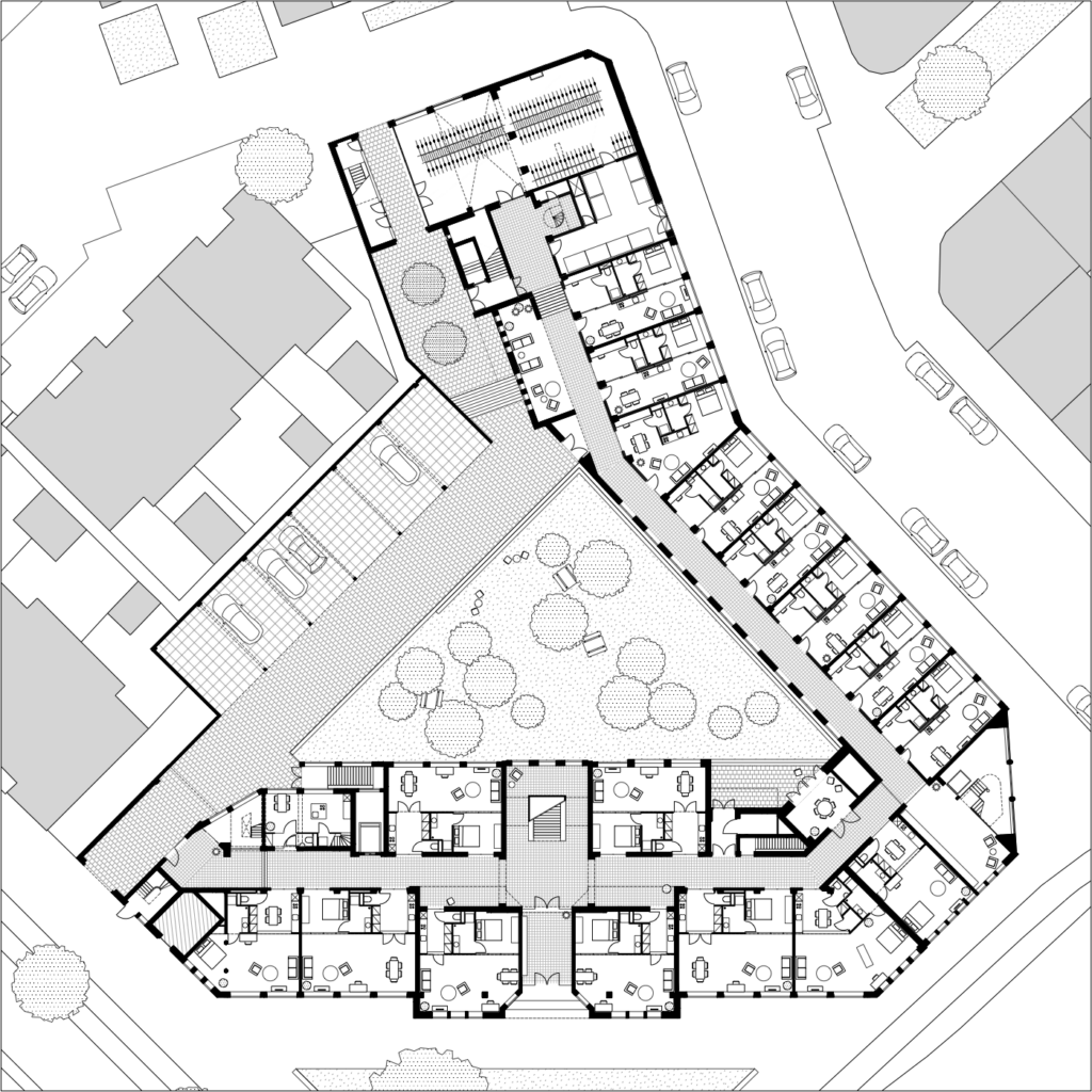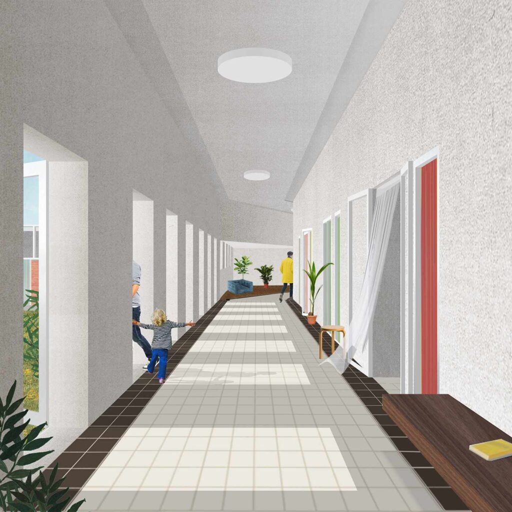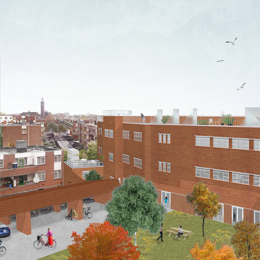 Het schoolgebouw krijgt door middel van een nieuwe isolerende binnenschil een comfortabel woonklimaat De binnenplaats wordt met de sloop van een niet origineel gebouwdeel en de nieuwbouw van een robuust bijgebouw omgevormd tot een omsloten tuin. De schoolgangen zijn een verlengstuk van de woningen en verbreden zich op verschillende plekken voor meer lichtinval en bieden plek voor ontmoeting.