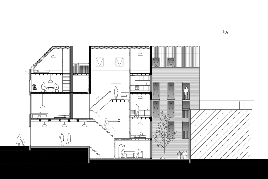 Een zware staalconstructie op de begane grond, gemaakt voor de grote kolomvrije winkelruimte die er in het verleden was, gaf ons in het ontwerp de mogelijkheid een centraal trappenhuis te maken zonder constructieve wijzigingen aan het gebouw. Vanuit dit trappenhuis worden alle bestaande verdiepingsvloeren bereikt welke ieder op verschillende niveaus van elkaar liggen. Hierdoor kan het casco zonder grote wijzigingen zo simpel mogelijk worden hergebruikt. Een nieuw daglichthof in het midden van het blok zorgt voor meer daglicht in de woningen en een bijzonder besloten gevoel.