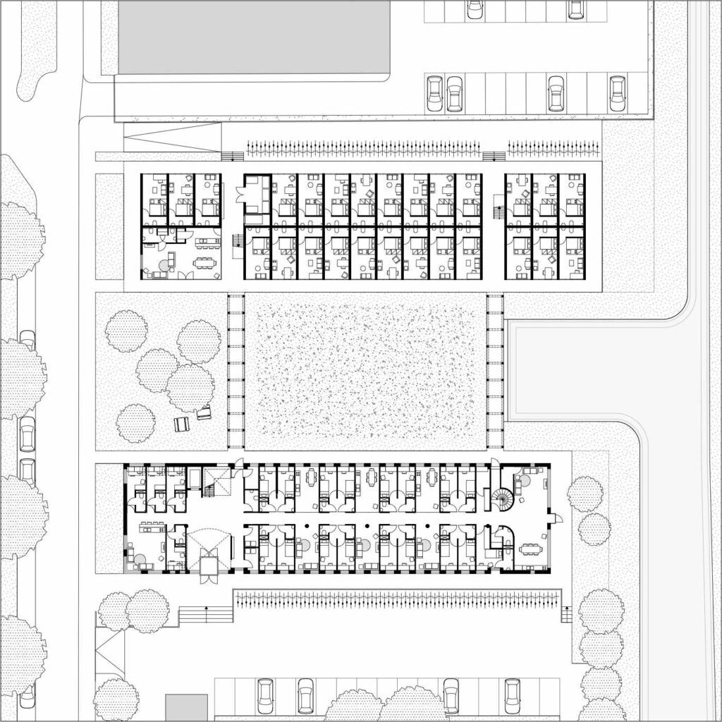 Het plan bestaat uit de transformatie van een kantoorpand en nieuwbouw van 250 studentenwoningen in Rotterdam Alexanderpolder. De locatie ligt ingeklemd tussen een drukke weg en een rustige woonwijk. De nieuwbouw zet de bestaande morfologische structuur voort, en met de toevoeging van verbindende pergola’s ontstaat een prettige collectieve tuin.