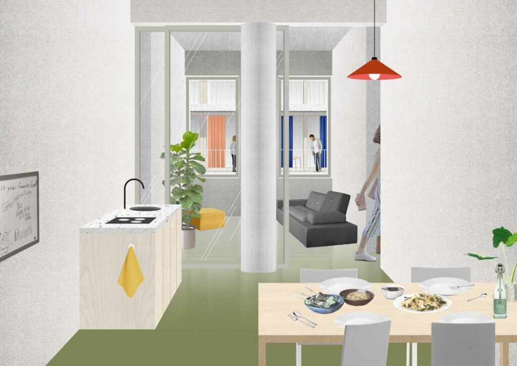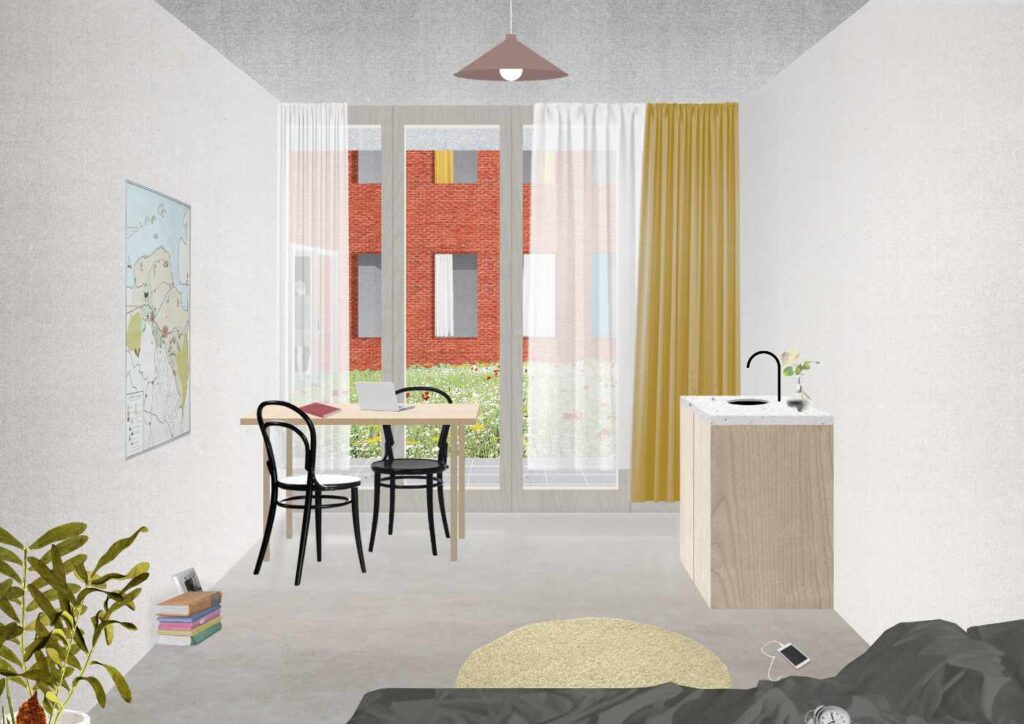 In het bestaande kantoorpand worden groepswoningen gemaakt. Hierbij ontsluit een centrale gang zowel de collectieve woonruimten als alle individuele studentenkamers. De collectieve woonruimten leggen dwarsverbindingen en brengen licht in de gang.